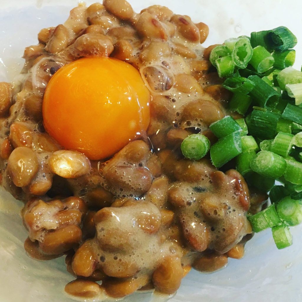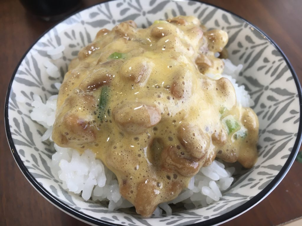 まず納豆を混ぜて、その後納豆のタレを入れ再び混ぜる。卵は黄身だけ取り出し混ぜて、ネギをかけ混ぜて完成。