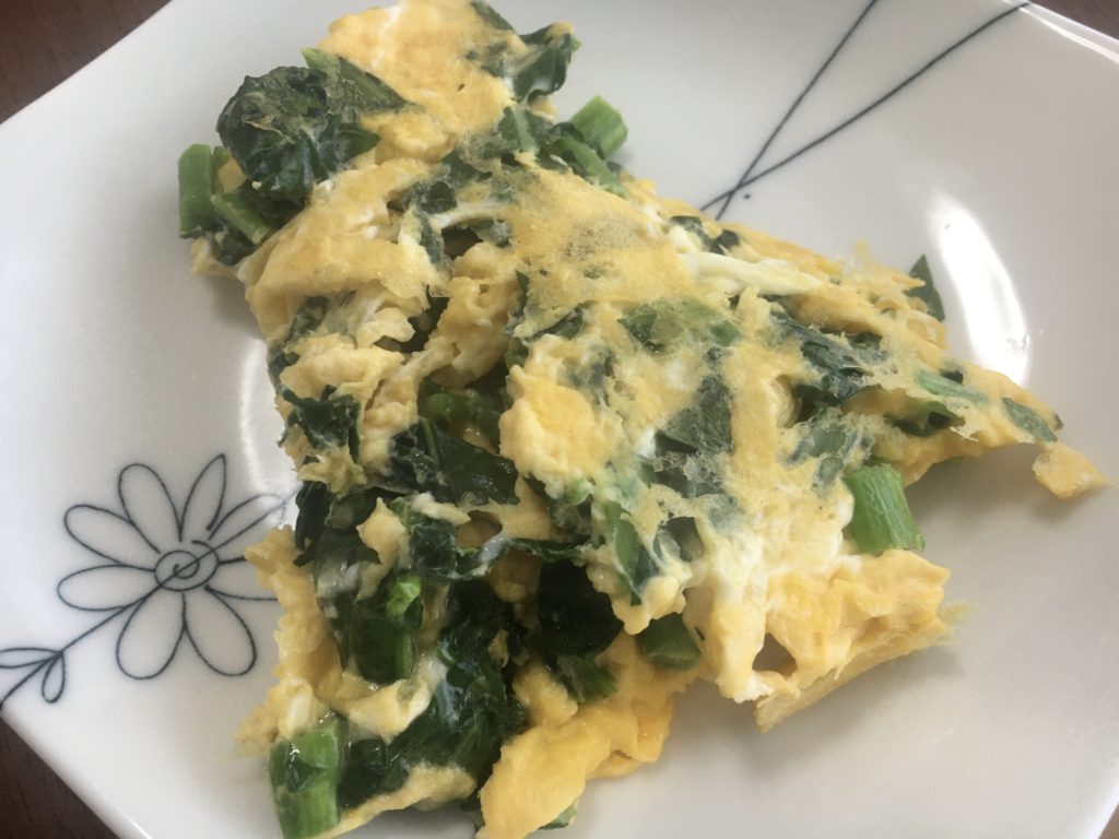 菜の花を炒めて、卵と塩を混ぜてかんせい。簡単だけど野菜が新鮮で、卵がいいので最高の朝食になります。